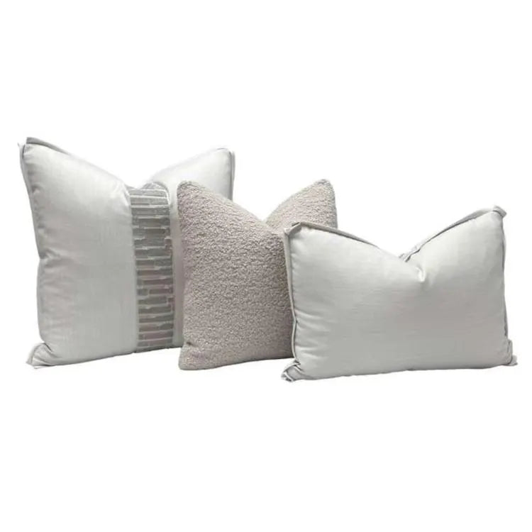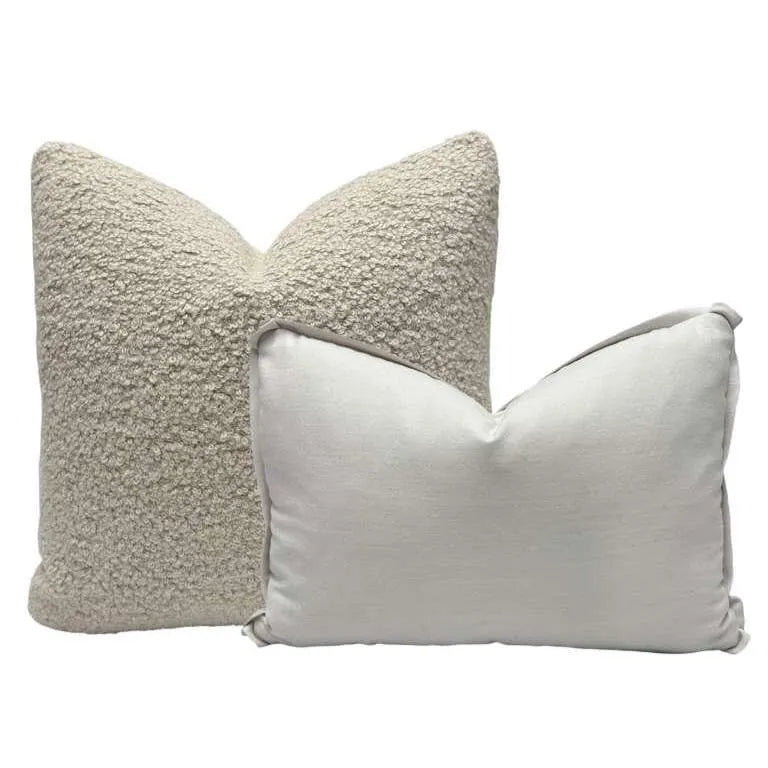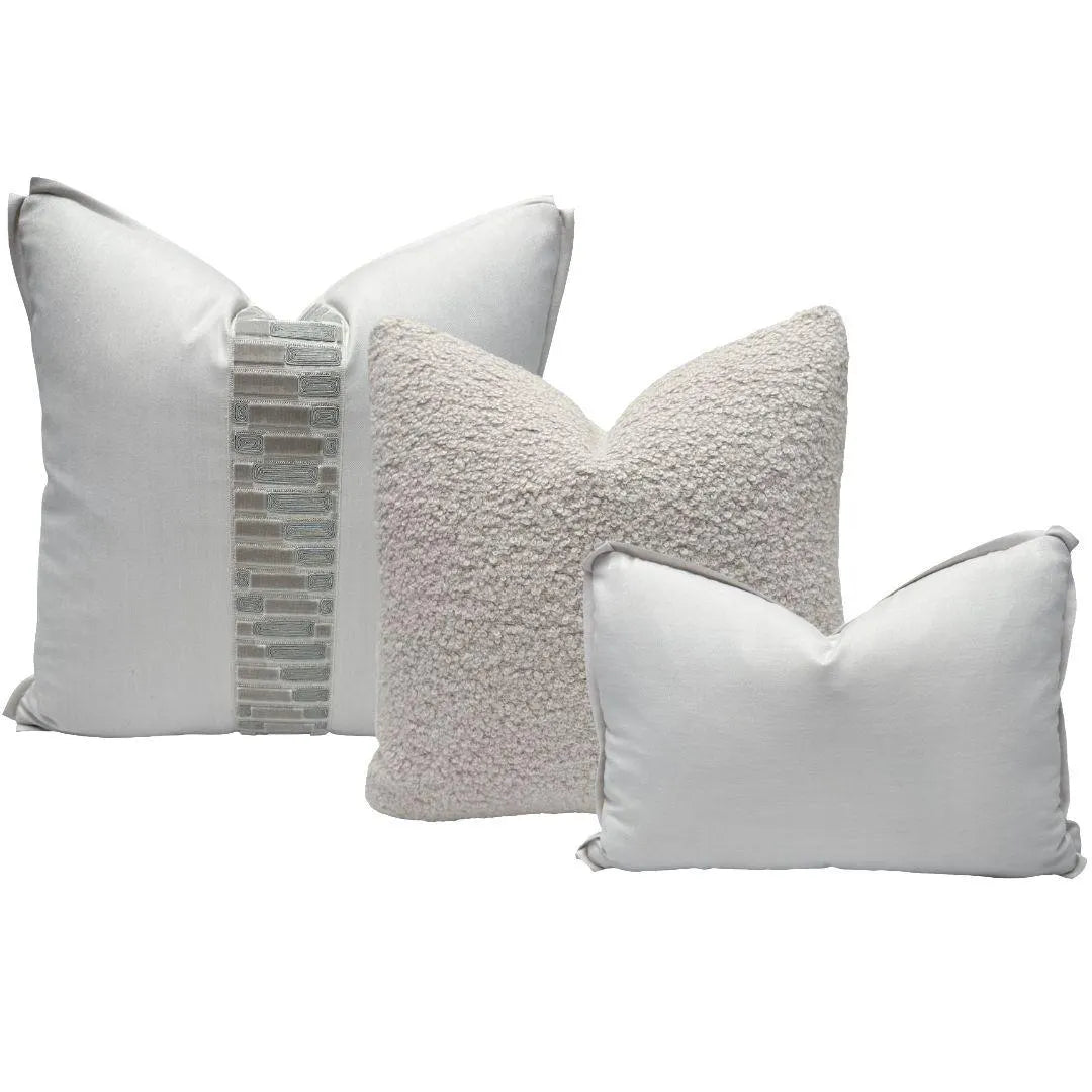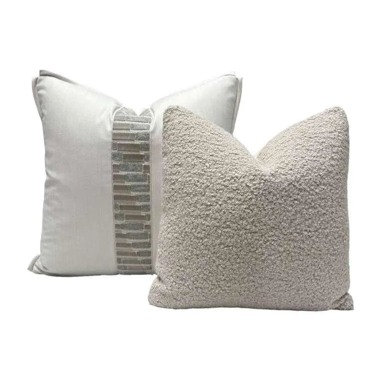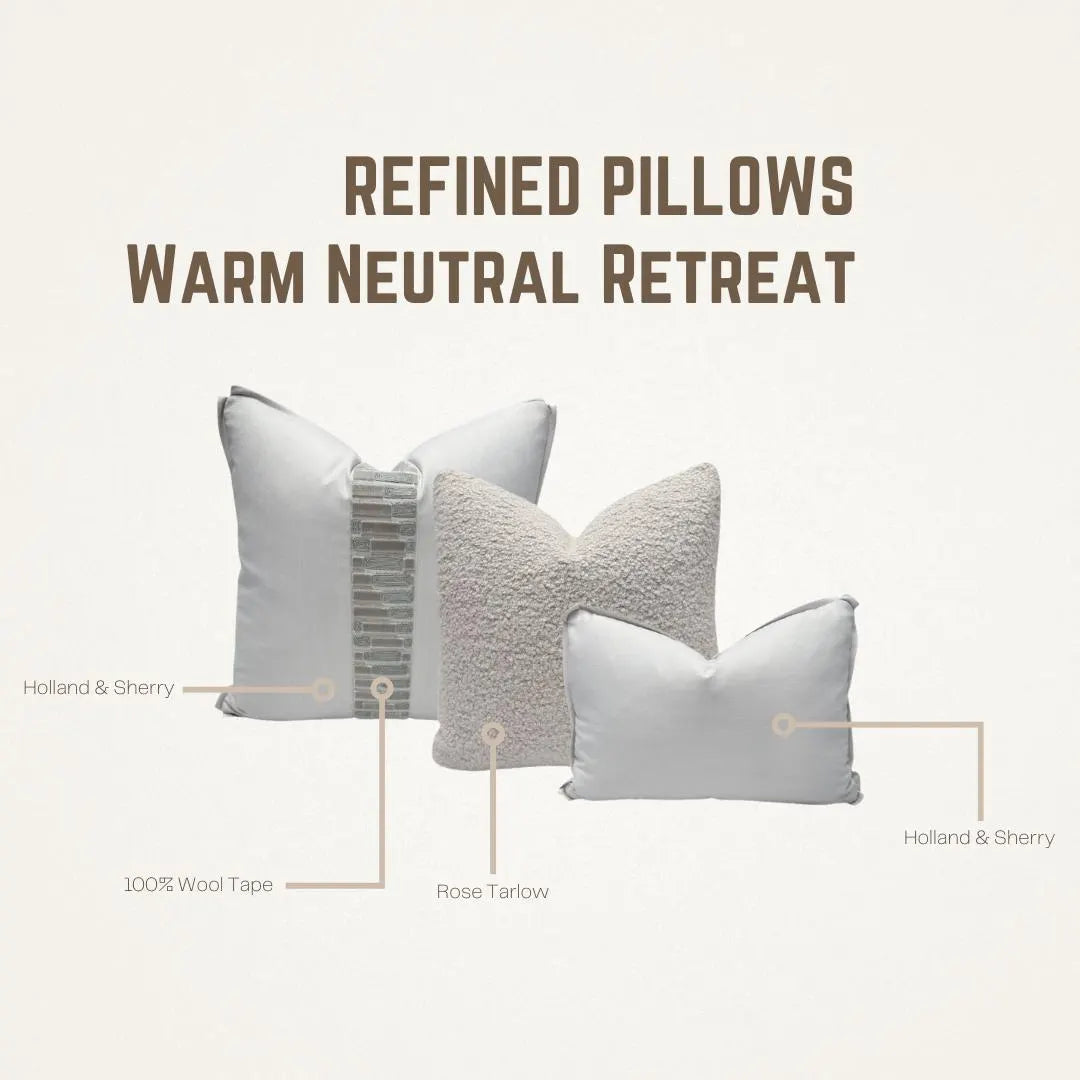 ✨ A thoughtfully coordinated pillow set featuring luxurious wool, soft alpaca bouclé, and refined neutral textures—highlighted by a Holland & Sherry decorative tape, offered as a complimentary design detail. ✨